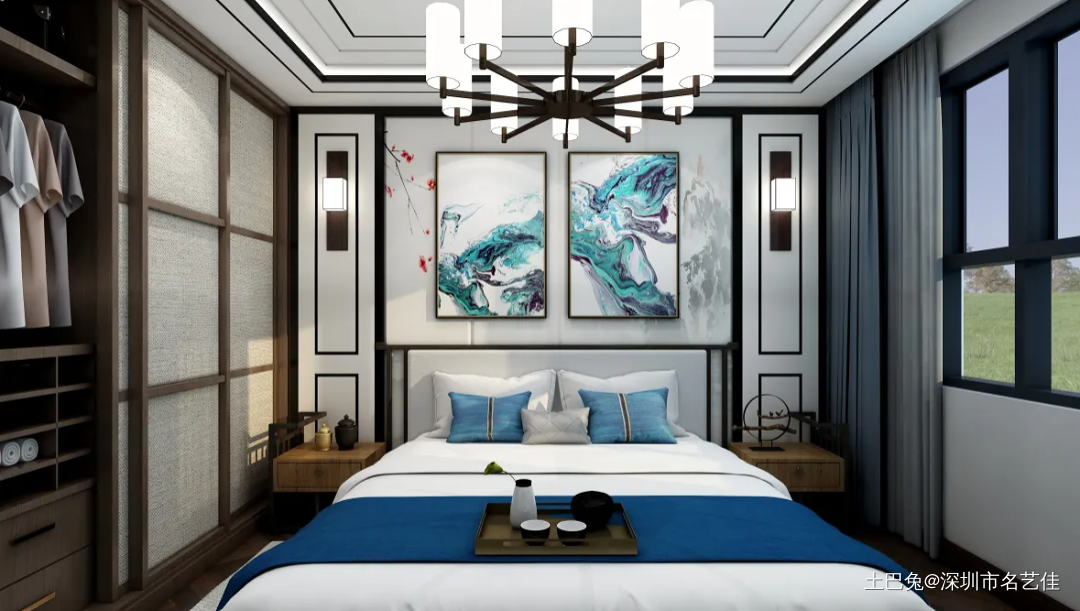 主卧设计追求豪华,加入木制家具,体现新中式风格