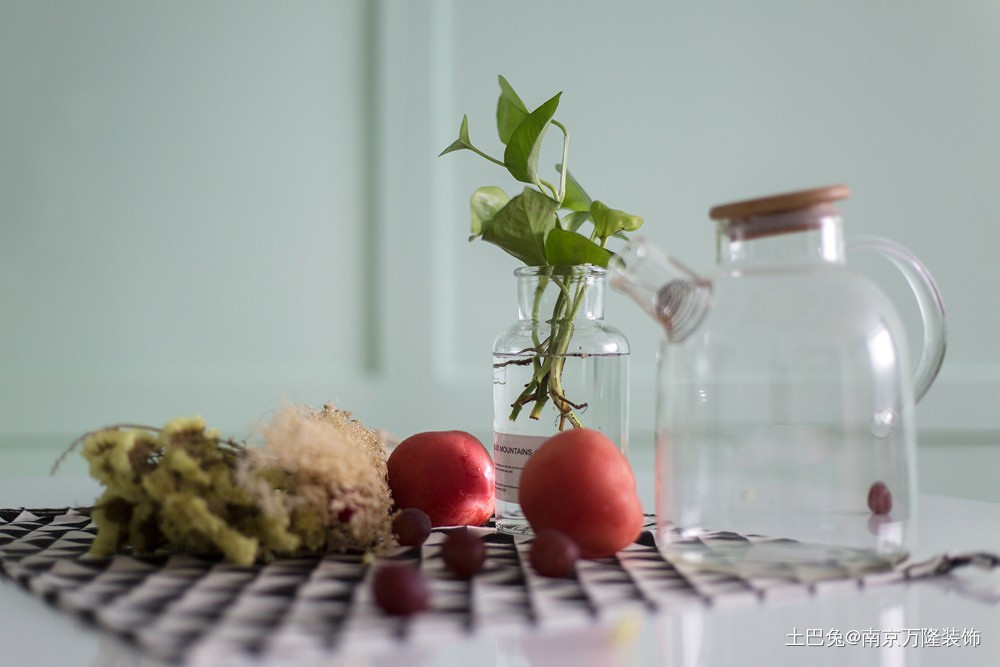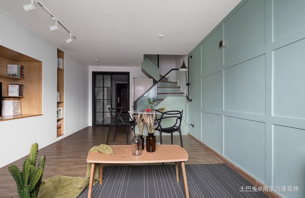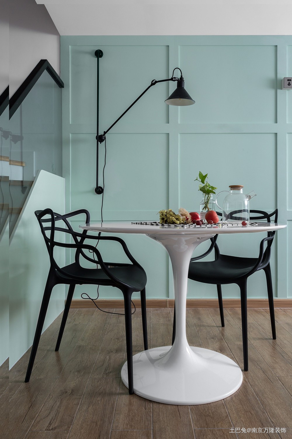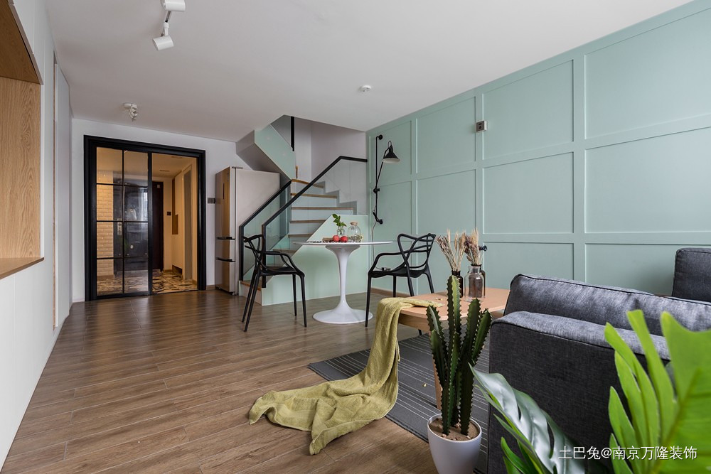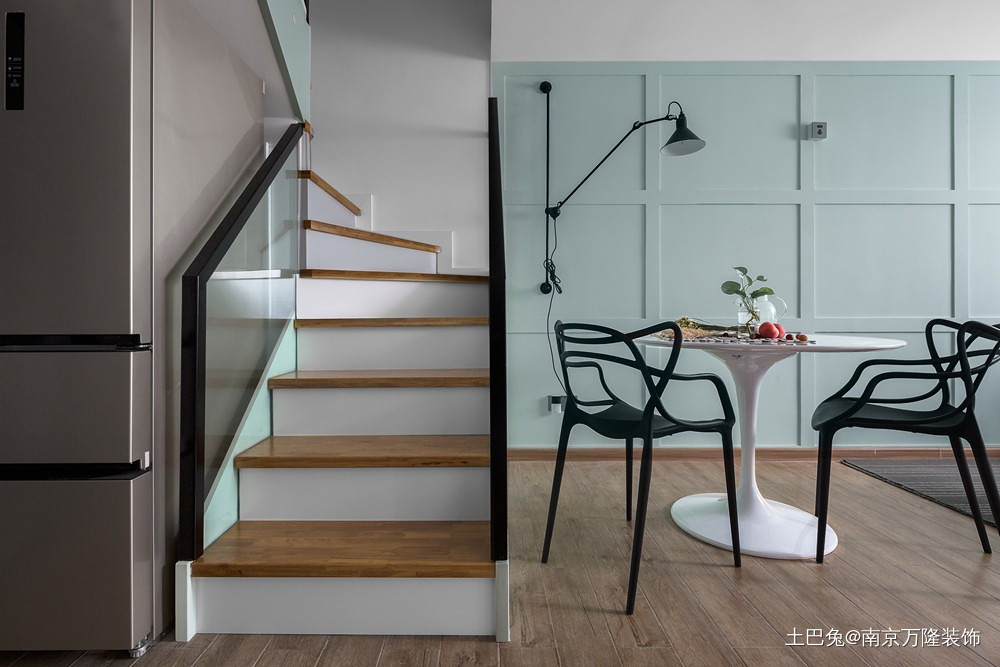 亲和木色和清爽白色一直都是好搭档,具有亲近感,易搭配。大块头的双门冰箱被塞进了楼梯肚,刚刚好。墙面简洁的线条边框设计,弱化了空间的拥堵感,注入纯净清透的薄荷绿,清新、柔和。