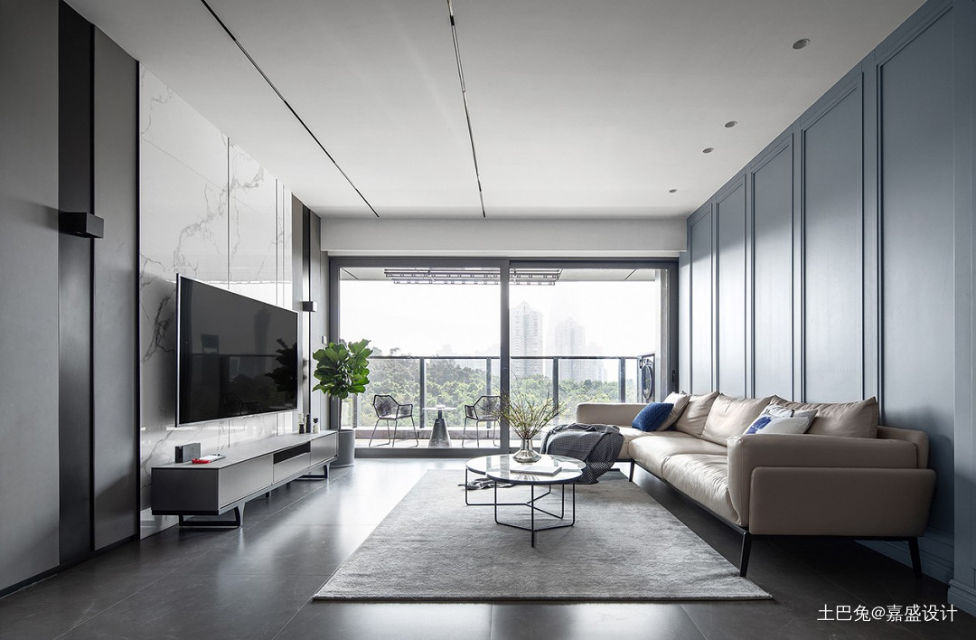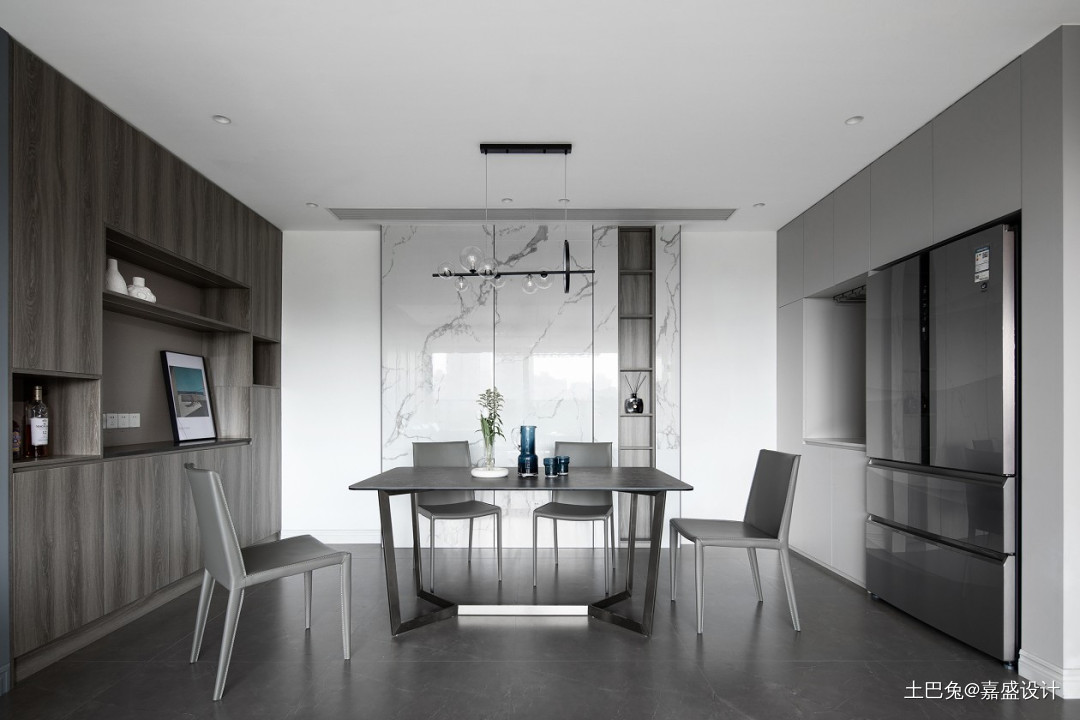 透过大面积落地窗迎接自然光入住,光、影、材的相互映照,视觉上越发和谐,营造理性内敛的奢华感。以高级灰为主基调,搭配纹理清晰的木饰面餐边柜,整体干净素雅、通透高级