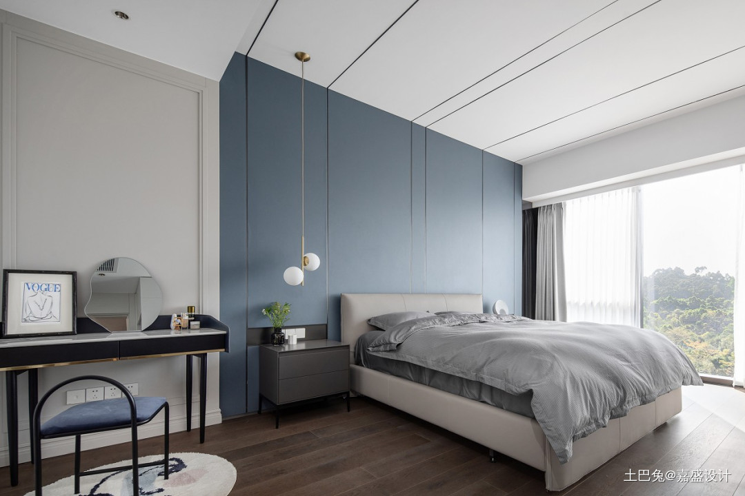 主卧延续雾霾蓝的主色调,以整面硬包+不锈钢作为床头背景墙,一派沉稳静谧之感。