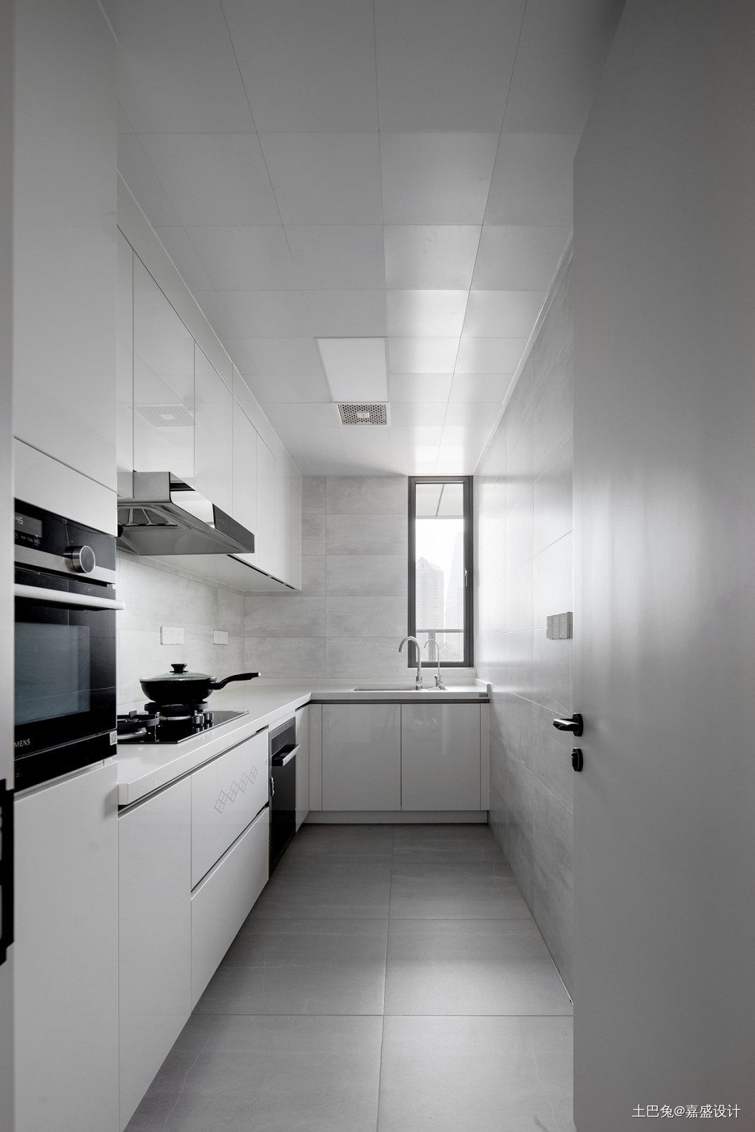 厨房素雅大气,浅灰色地砖搭配浅色纹理墙砖和白色橱柜,纯净的配色勾勒出简约大气的烹饪空间。充分利用墙面空间,加设横排吊柜+竖排电器柜,蒸箱、烤箱、洗碗机都可嵌入其中,柜门一关便是整洁一体化的视觉感。