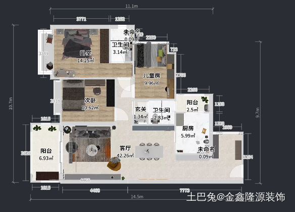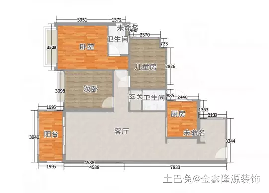 案为90平的平层三房户型,起始户型还算比较周正,虽然缺一角,但是房子南北通透,两个卫生间都很小,为了布局的合理规划,将空间利用,我们把每个空间都充分起到了扩大和功能性作用。