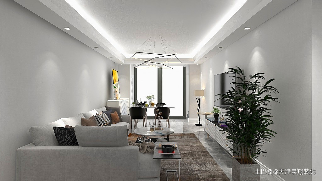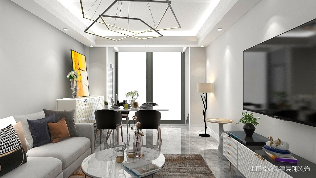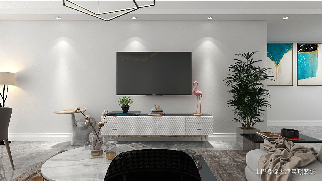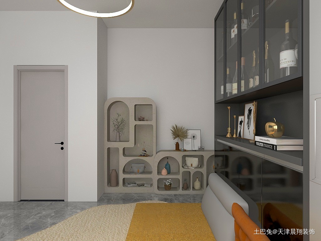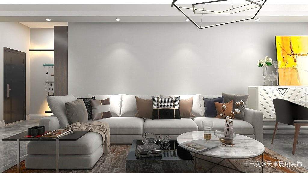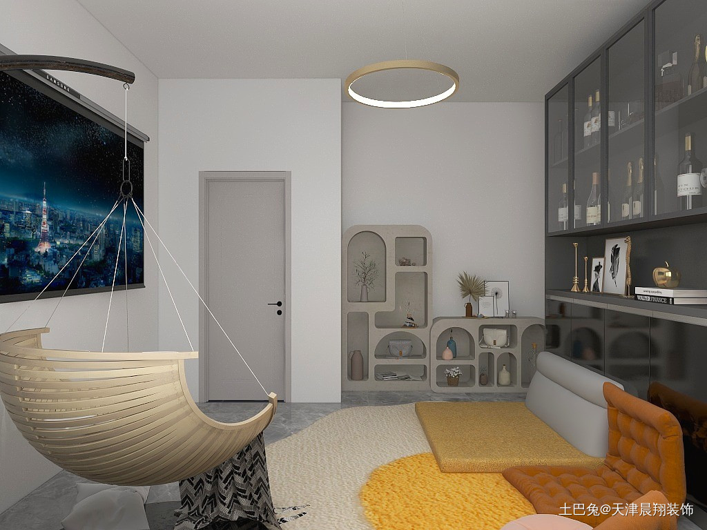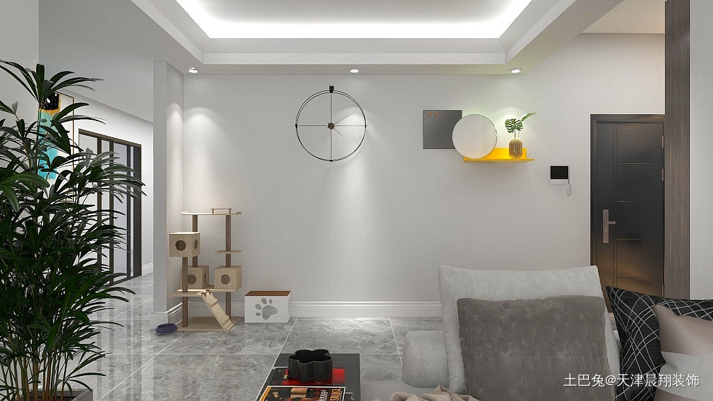 客厅不要过多装饰,放置必要家居即可。家里有猫所以给小猫一个可以娱乐的空间。