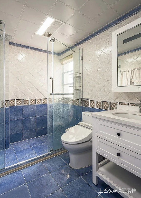 卫生间做了干湿分离的设计,方便业主打理。整体选用蓝白色系仿古砖,带来清新自然的气息。