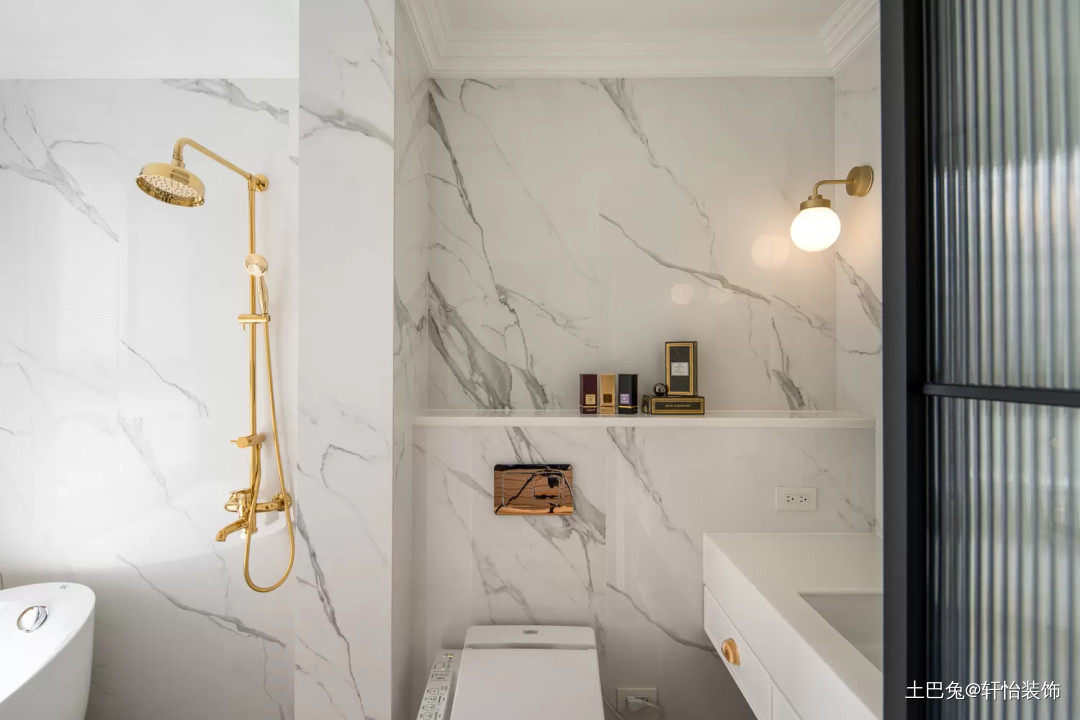 卫生间是清爽的配色,给人一种空间比实际宽敞的错觉,金色的花洒吸睛极了,不过分强调,却给到人精致高级的感觉。