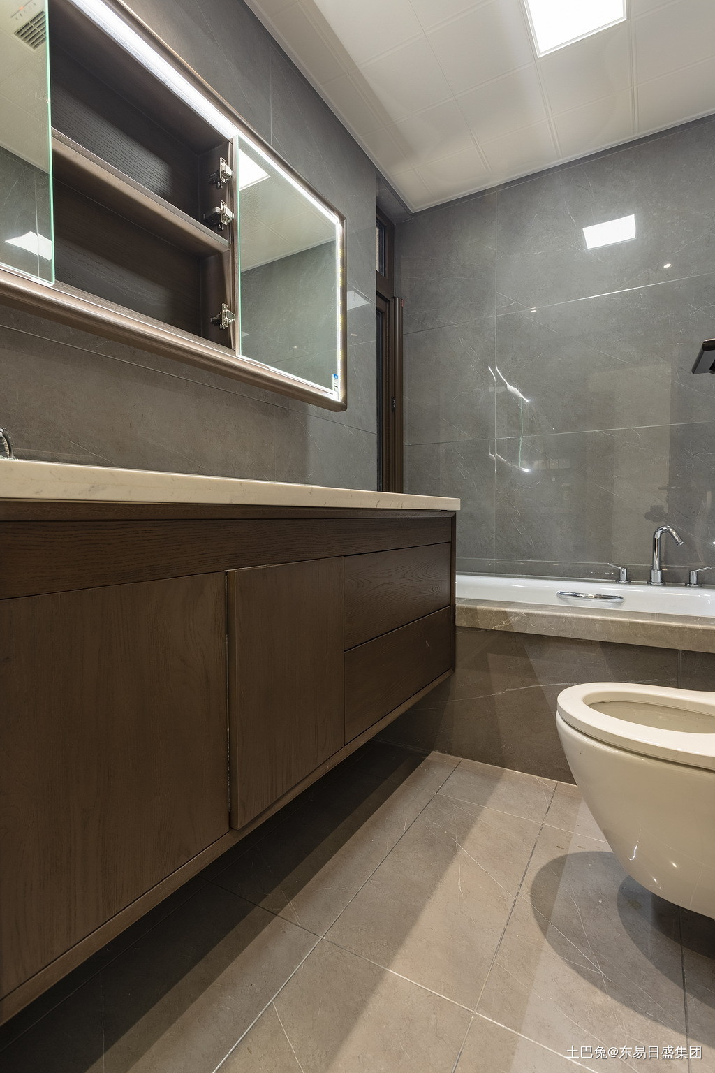镜柜的设计很棒,既能照镜子又能放置平常要用到的洗漱用品,整体看起来空间很大。