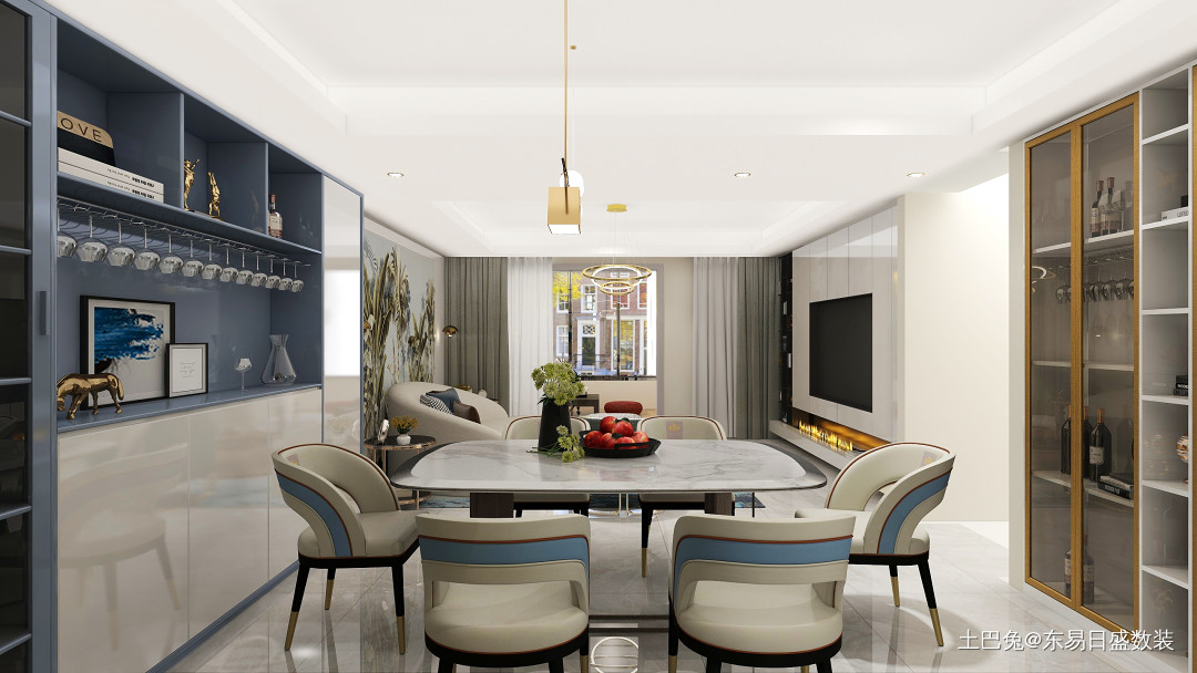在餐厅位置放置了餐边柜和酒柜,可以很好的解决储物与摆件问题