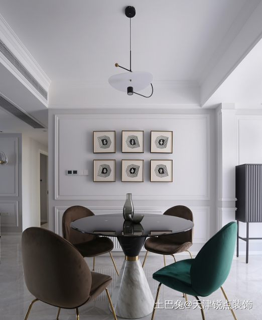 圆形餐桌使动线流畅,餐桌造型轻盈,和悬浮感吊灯相呼应。