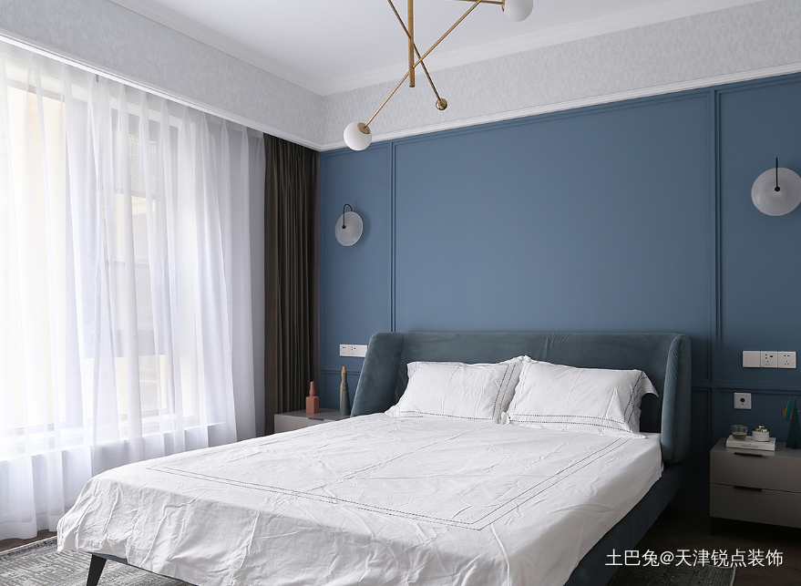低饱和度的静谧蓝色,铺陈着这个空间的大基调,而细看其中,精细的线条叠加勾勒、上部墙面墙布纹样的淡淡隐现、短绒面料床头,都在诉说着空间的精致细节。