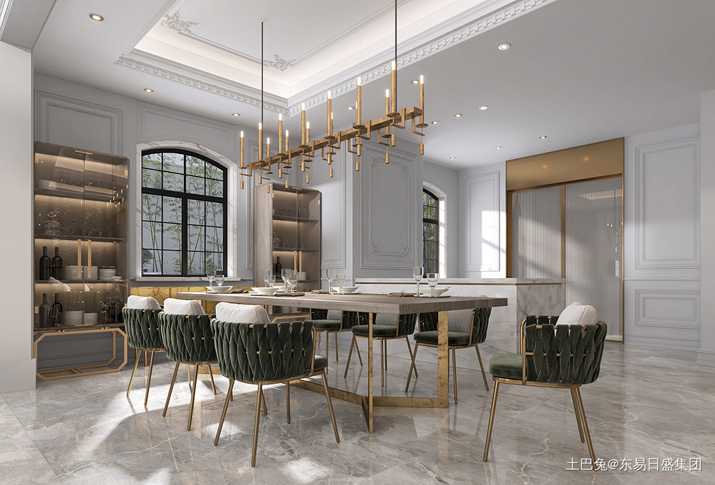 餐厅多处采用金属线条设计,配上奢华的水晶灯,法式轻奢感扑面而来。餐厅墙设计成收纳功能强大的柜子,整体采用乳白色,高级又浪漫。