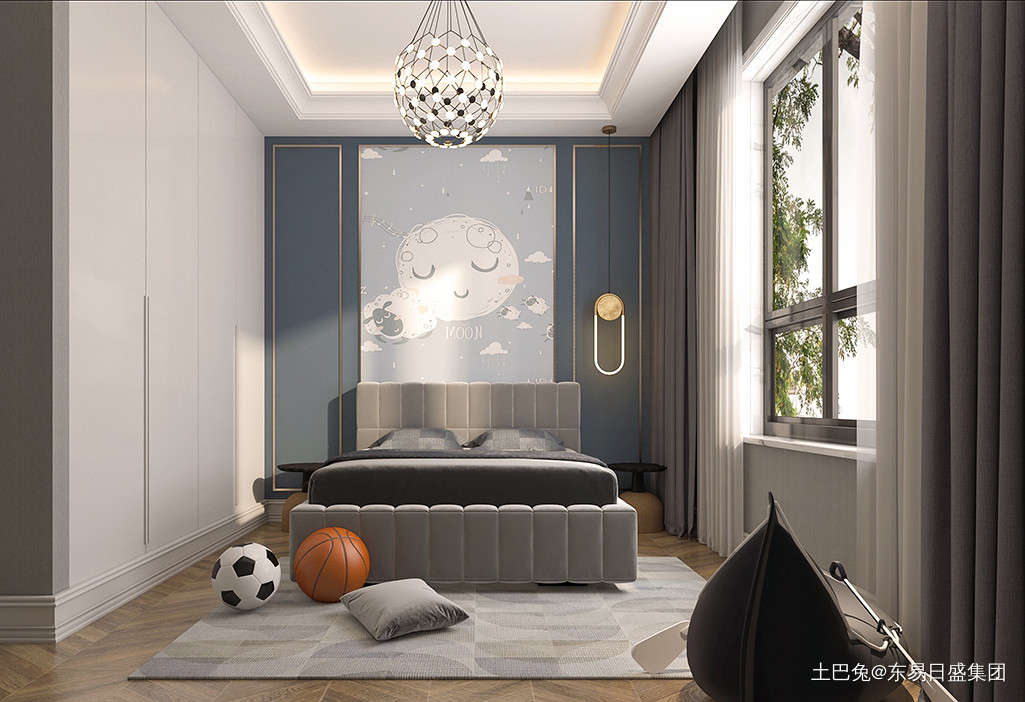 采用蓝白灰三色作为弟弟房的主色调,简约的窗帘配上清新的主色调,房间内配有特色的潮流装饰品,让空间整体更具活力与潮流感