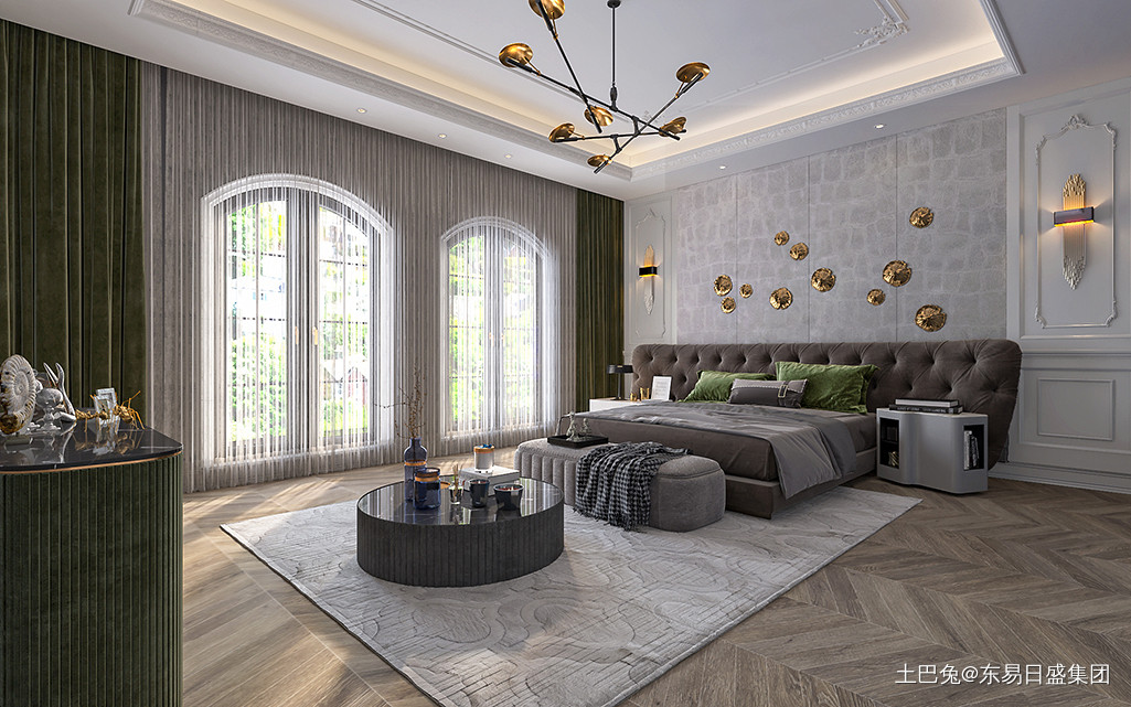 主卧采用奢华的金属水晶灯,配上同系列的吊顶花纹,整体设计感十足。条形木饰面的存在,让空间造型感十足。