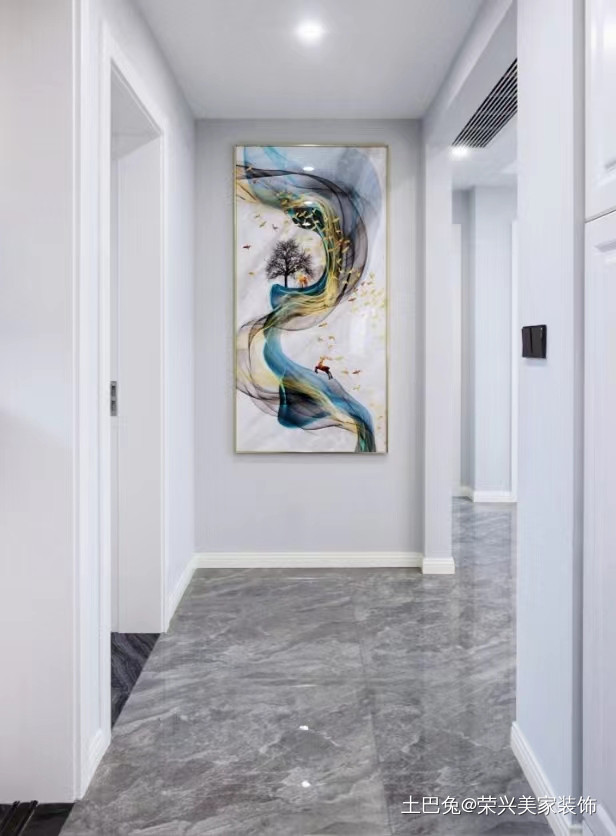 纯白色的墙顶面和大理石纹地砖让空间严谨有序,搭配抽象壁画使色彩在空间延伸碰撞