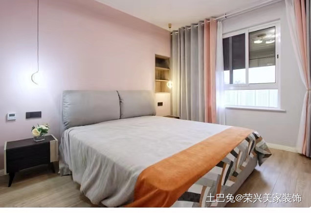 粉色床头搭配暖色灯光,给卧室蒙上了一层静谧温馨的格调