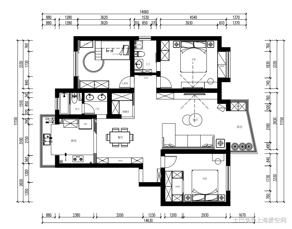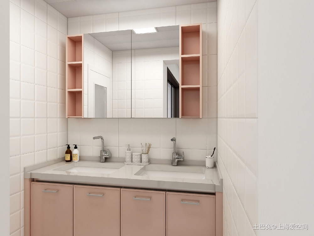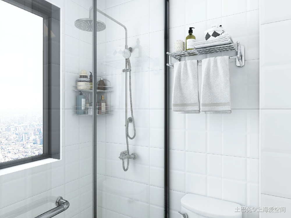 两个卫生间,其中一个只满足洗漱的放在主卧使用,另一个做了干湿分离做客卫使用。
