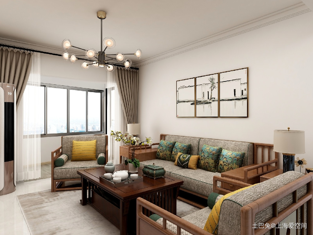 客厅内,业主原有的家具是偏中式的家具,我们整体还是给他做了整体新中式的搭配。