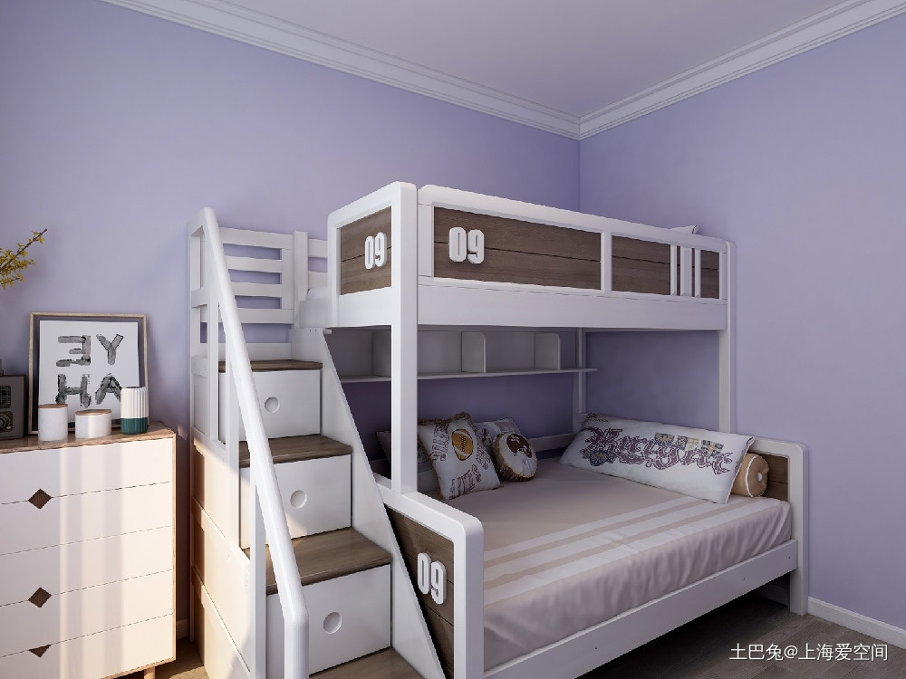 儿童房整体选用了粉紫色进行装饰,里面放的是上下的母子床。