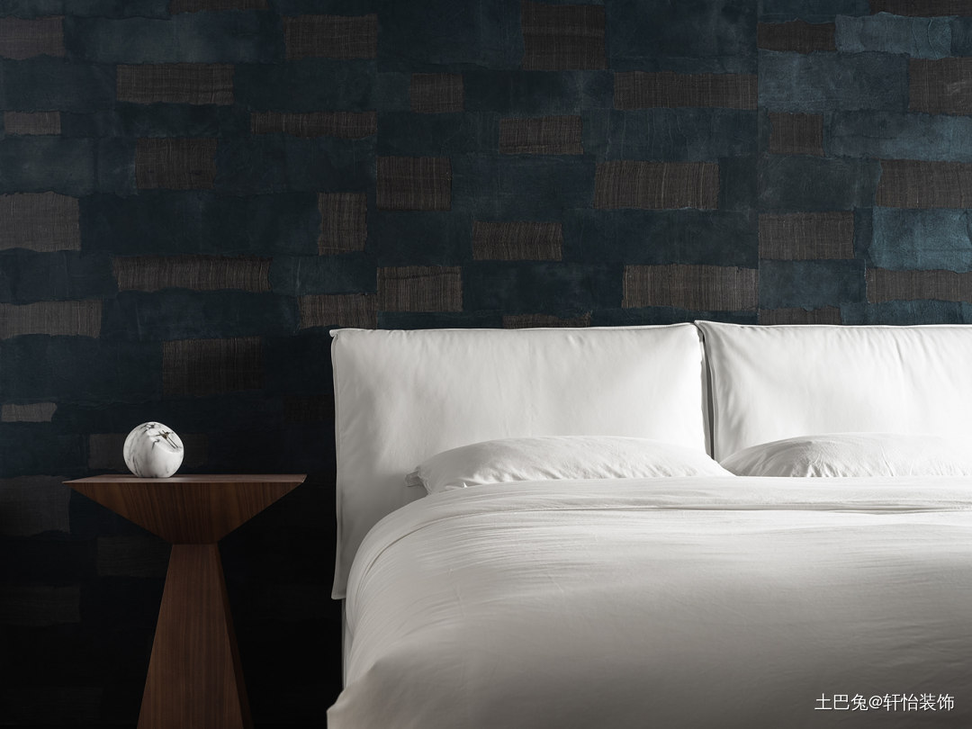 纯白色的床套与墙壁的灰黑色交织的背景墙,形成了强烈的对照效果,床边的干净木质小桌台,使得整个卧室更具现代简约风。
