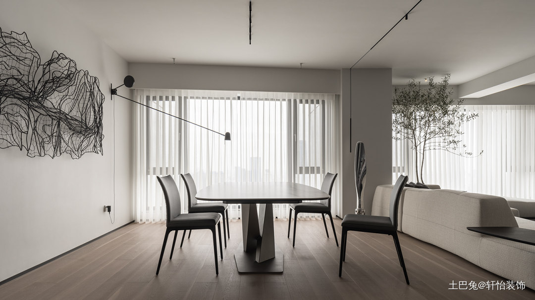 整体的米白色设计,大飘窗的进光量,更能加大人们的食欲,墙侧的不规则网状物件,给餐厅一种干净简约的风格,同时也突出了现代感。