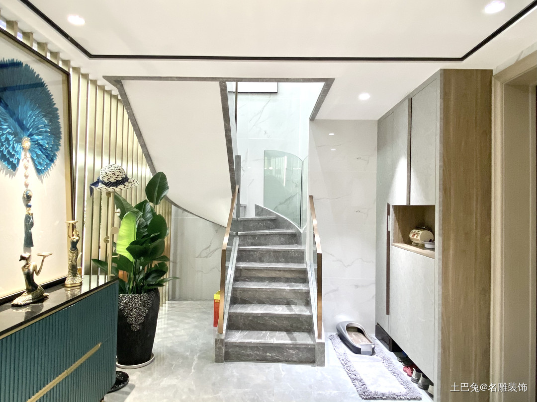 玄关楼梯处,入户门右侧打造成与墙壁一体的玄关柜,浅灰色大理石楼梯搭配透明玻璃扶手,加以金属边框点缀,精致有格调。