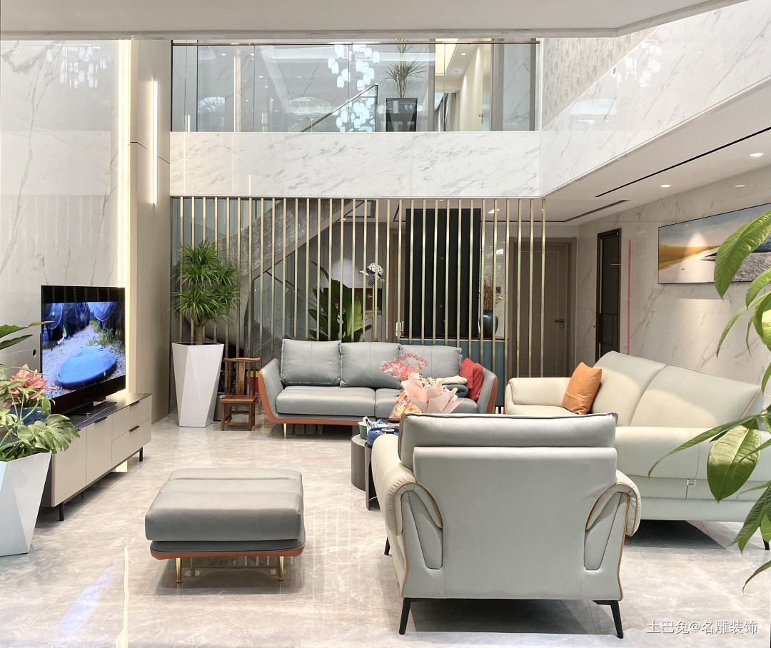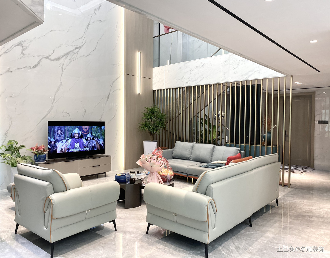 客厅,两层挑高中空设计,玄关直入客厅,使用金属栅栏条区分空间,隔而不断。沙发、茶几、电视机布局呈围合造型,光泽温润的大理石墙地面搭配同色系的皮质沙发,看起来浑然一体。