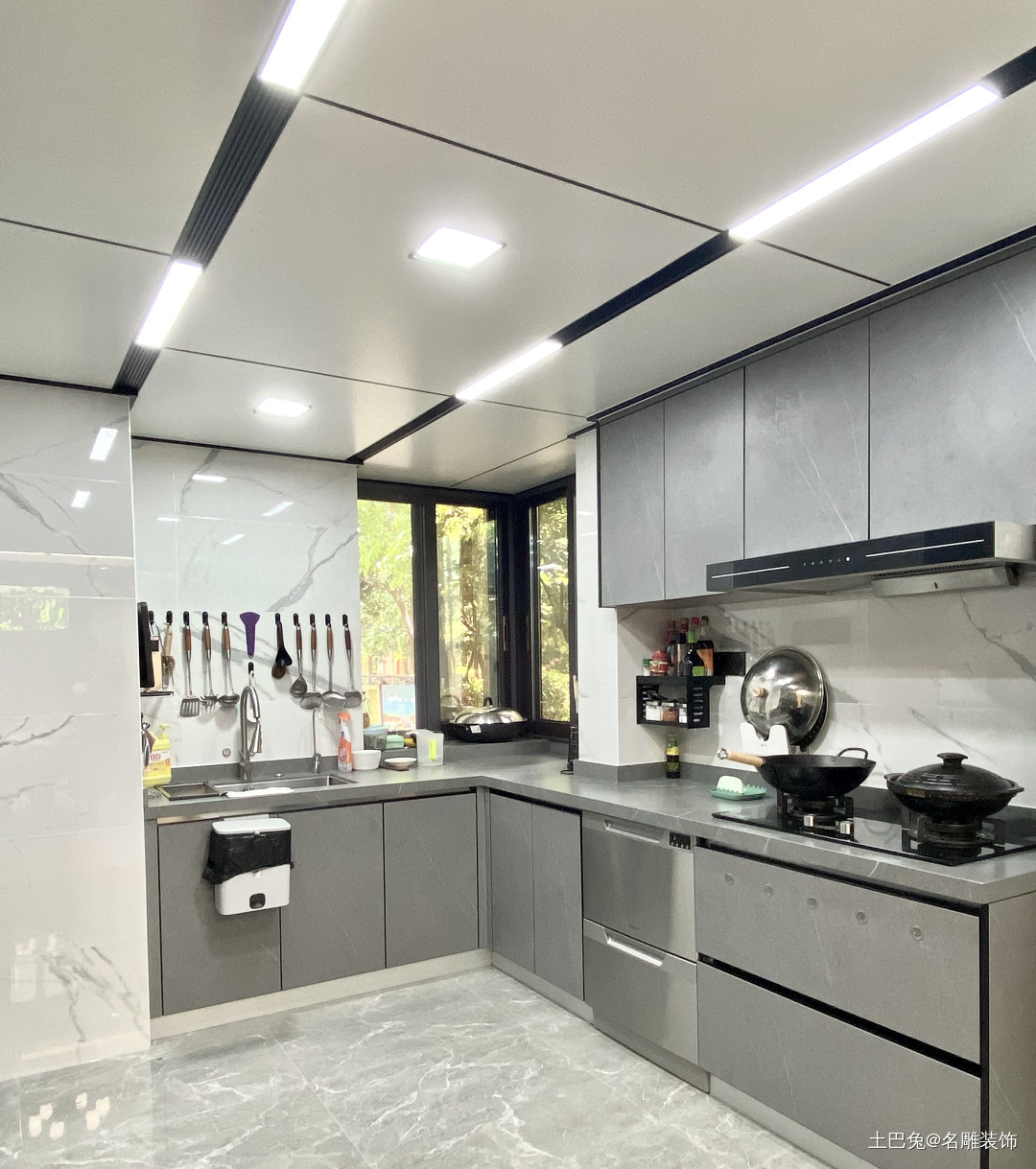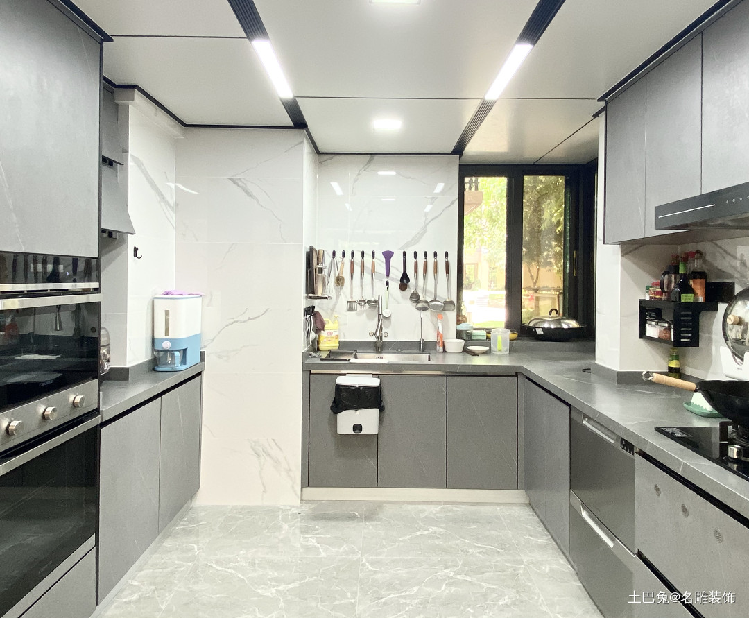 厨房采用适当的上墙收纳设计,日常使用的厨具以及调味品收纳在显眼处。厨房使用了可拆卸性的集成吊顶,能够有效隔离油烟及水汽,后期维修也方便。