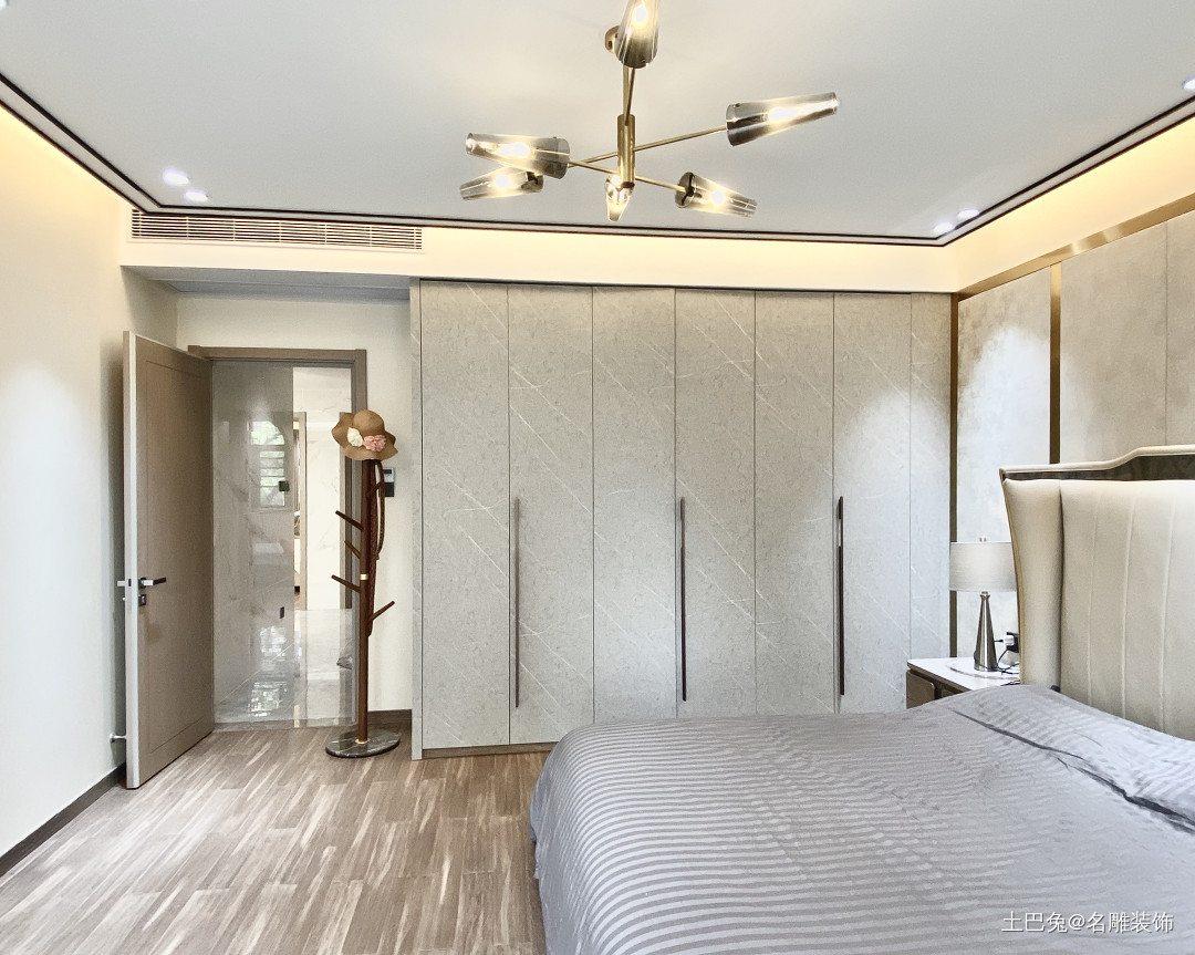 床头一旁定制与背景墙同色系的到顶衣柜,收纳容量大且不占用过多的卧室空间。