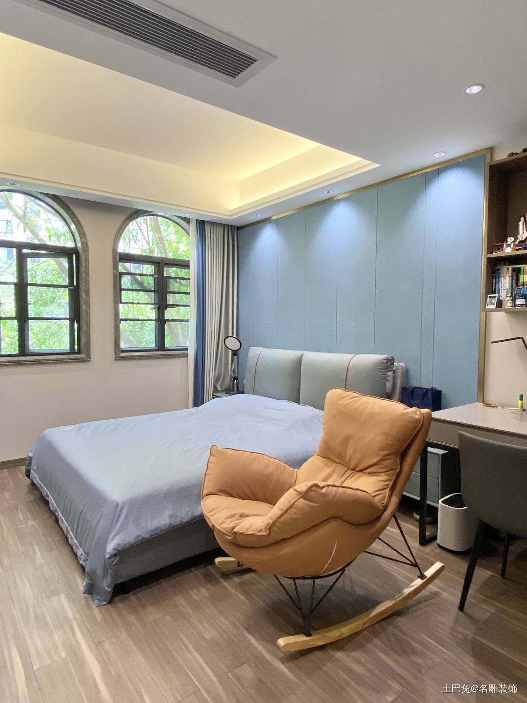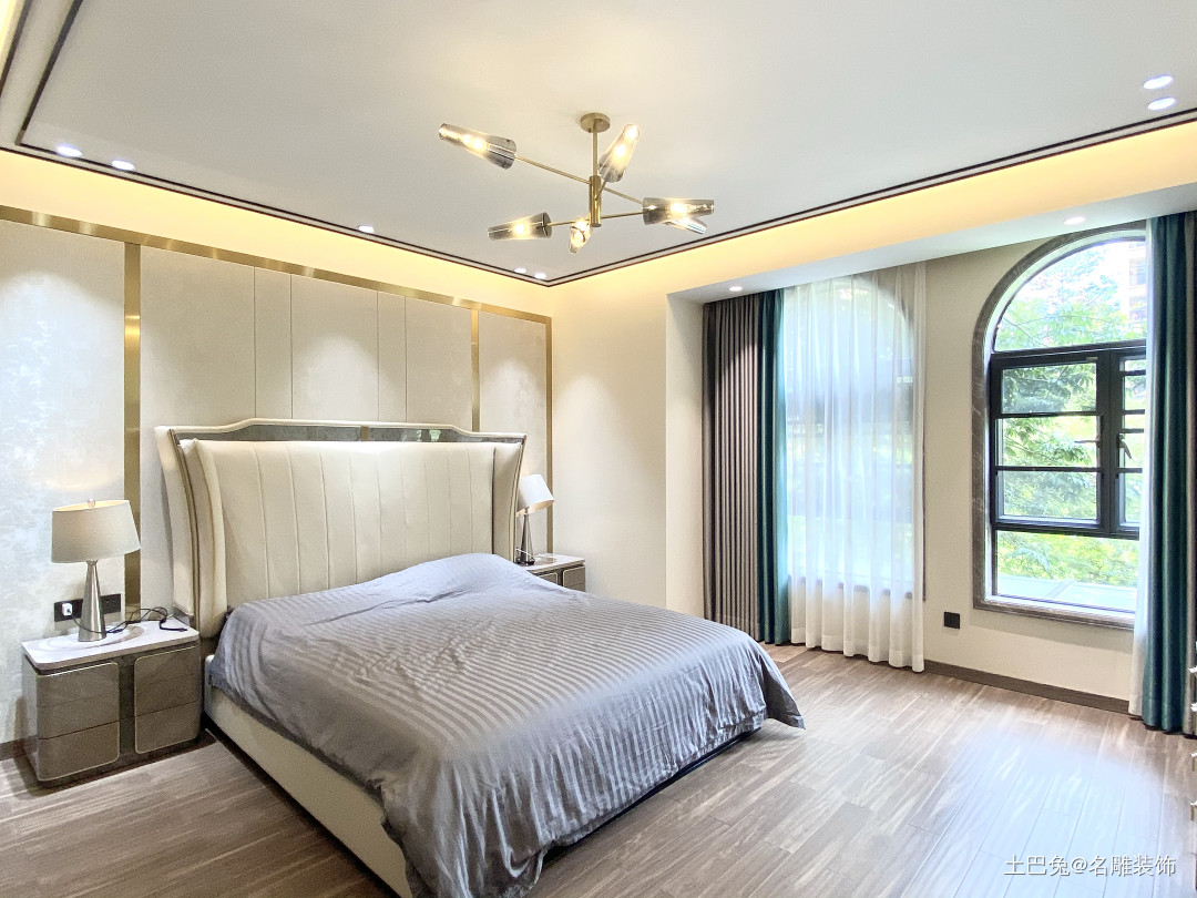 主卧铺设木地板,床头背景墙使用金属框线点缀,两扇圆弧形的窗户设计增强空间质感,简洁又独特。