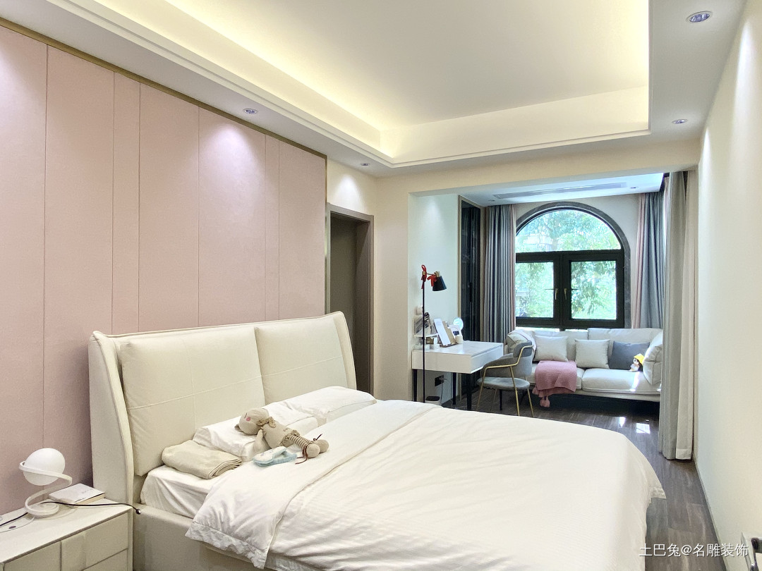 女儿房空间布局温馨舒适,乳白色的床体搭配水粉色背景墙,配色简单温和,无主灯设计,散发出的灯光也更加柔和舒适。