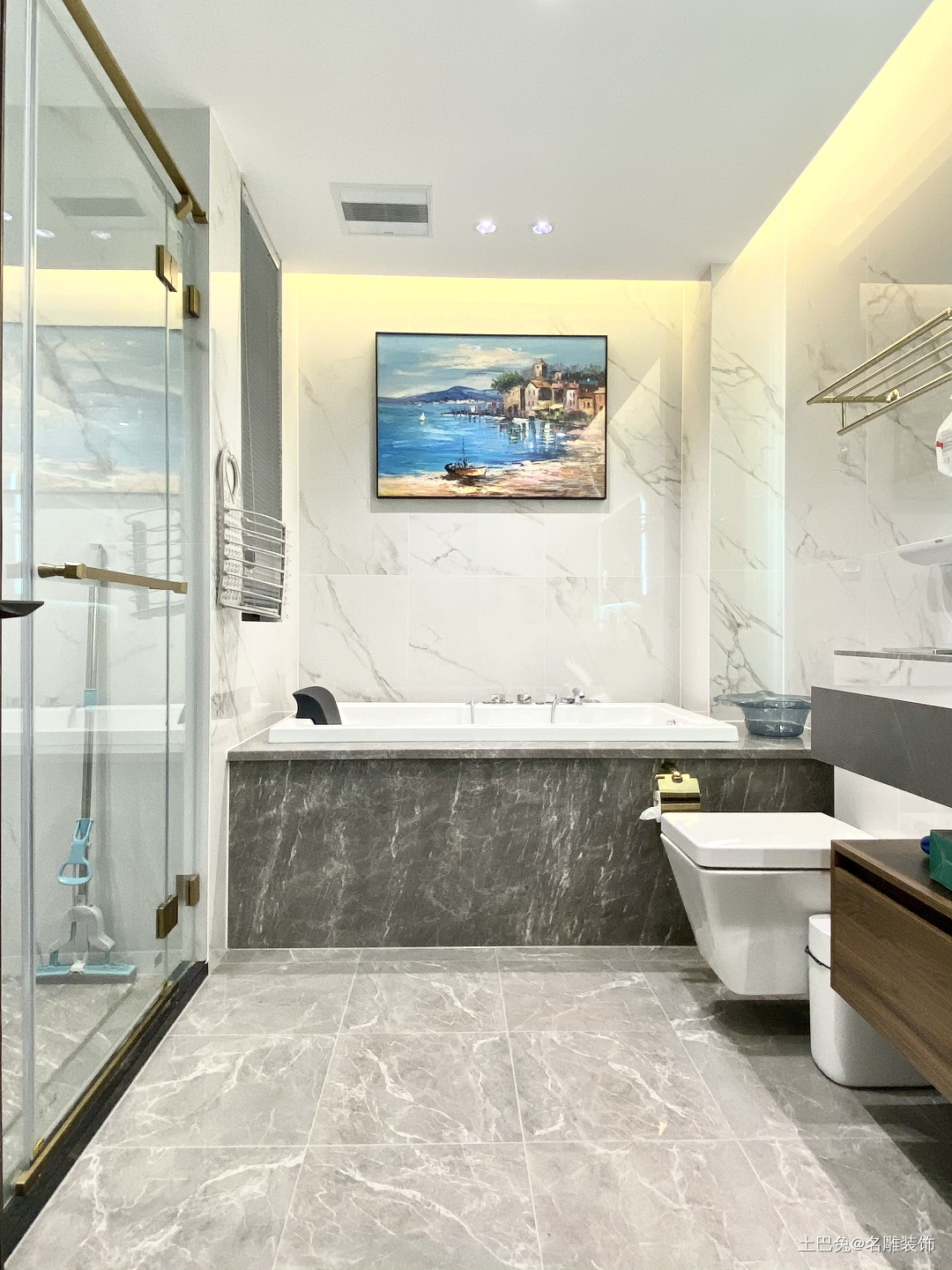 卫生间选择了比较耐脏的浅灰色大理石装饰墙地面,,淋浴区使用玻璃门分隔实用,干湿分离布局。浴缸嵌入式安装在在座台上,既减少了浴缸外部的卫生死角,使用起来也更加舒适。
