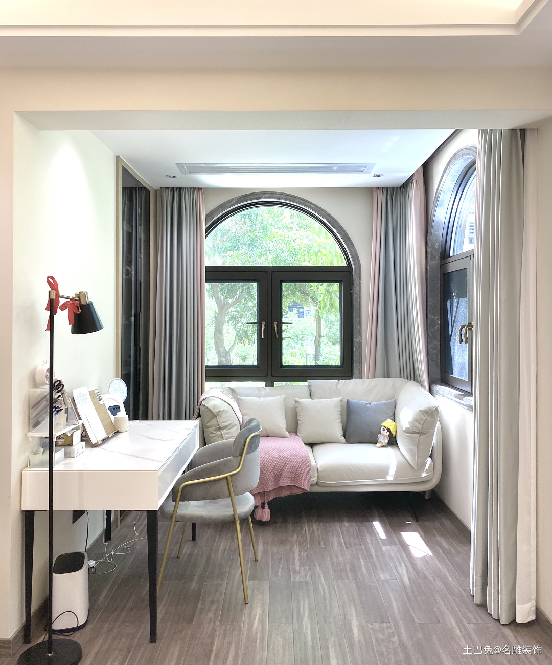 圆拱形的窗户外是葱郁的绿植,阳光随着斑驳的树影跃入双人沙发上,独处小空间自由肆意。