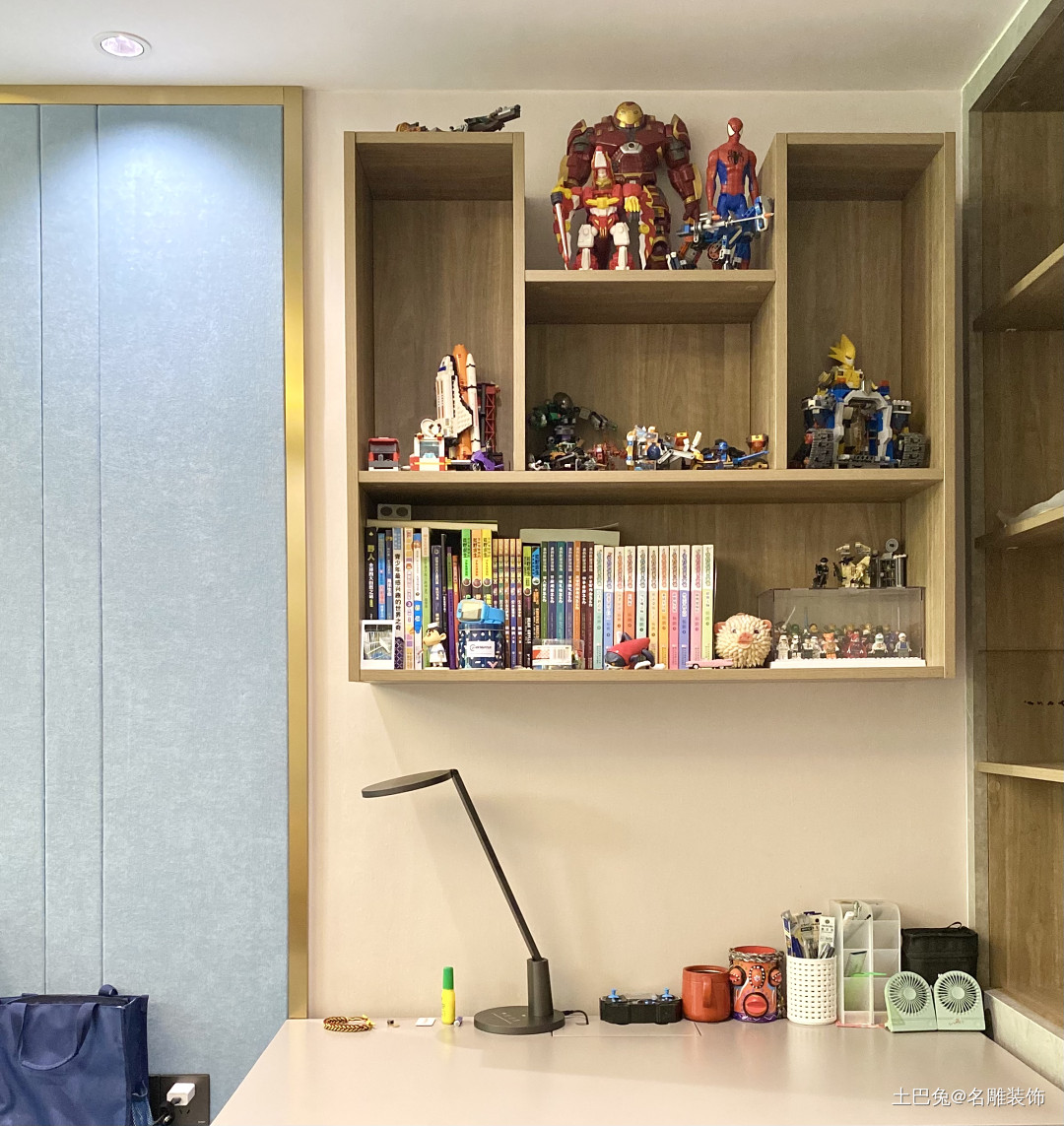 小书桌面积不大,墙上的的极简书架收纳容量充足,展示二次元人的心爱手办。
