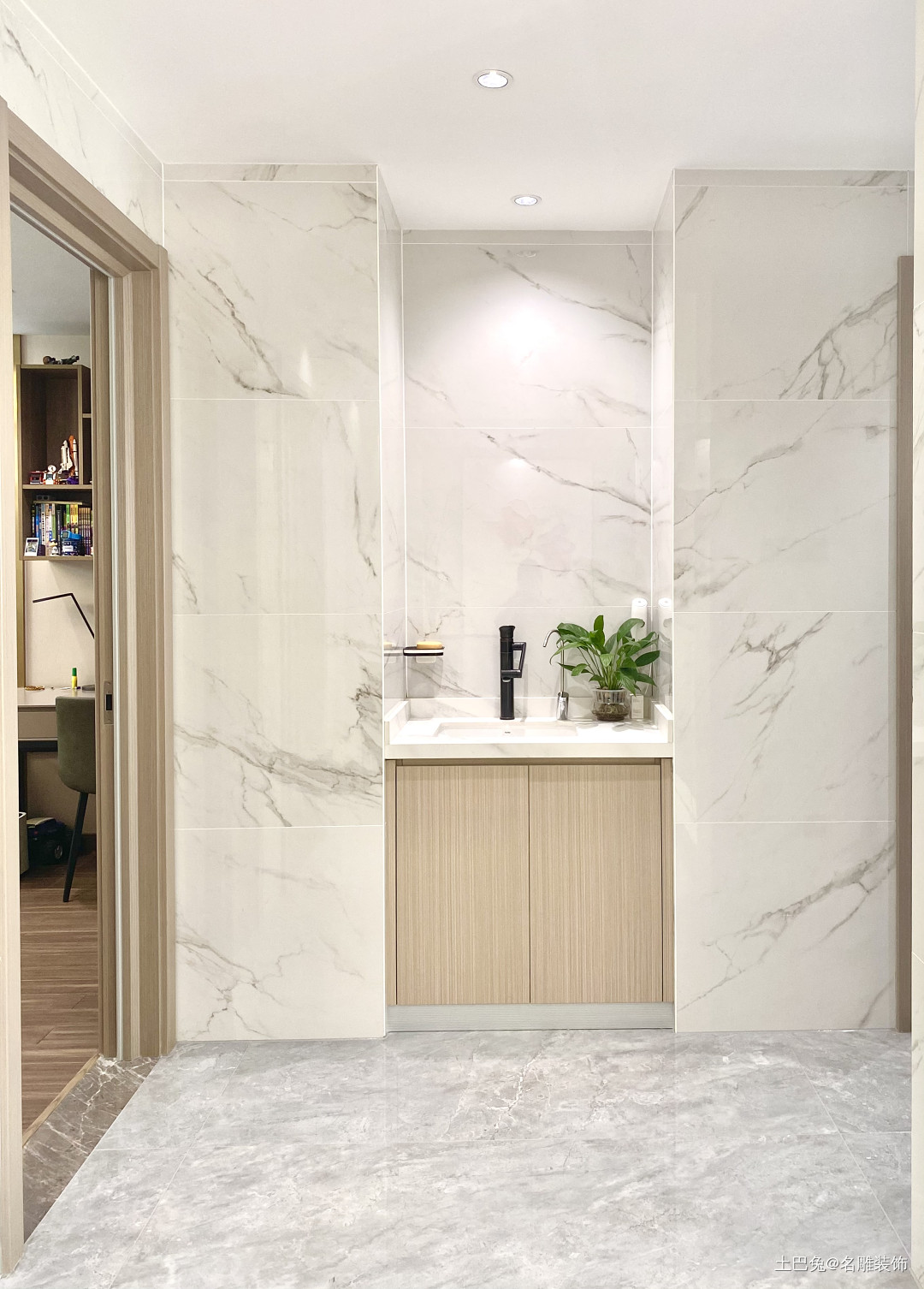 主卧和男孩房之间的过道设计有一个小小洗手台,兼具实用性与装饰性。