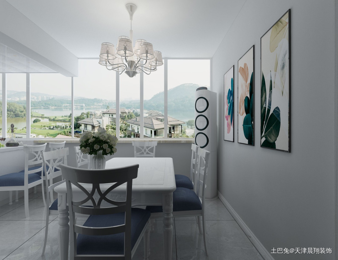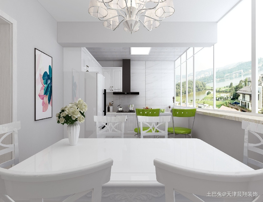 六人餐桌简约时尚,餐厅整体白色为主,彩色装饰画的点缀使餐厅整体更出彩。