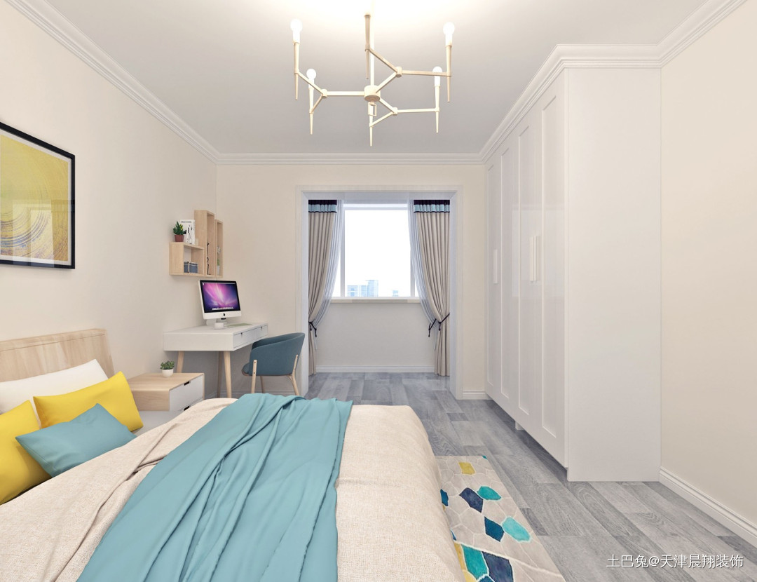 卧室整体以白色为主,蓝色黄色为辅,房间整体看起来明亮宽敞。