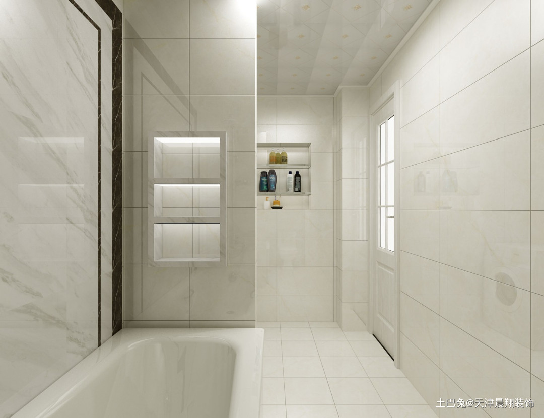 卫生间整体以白色大理石纹样瓷砖为主,整体明亮。