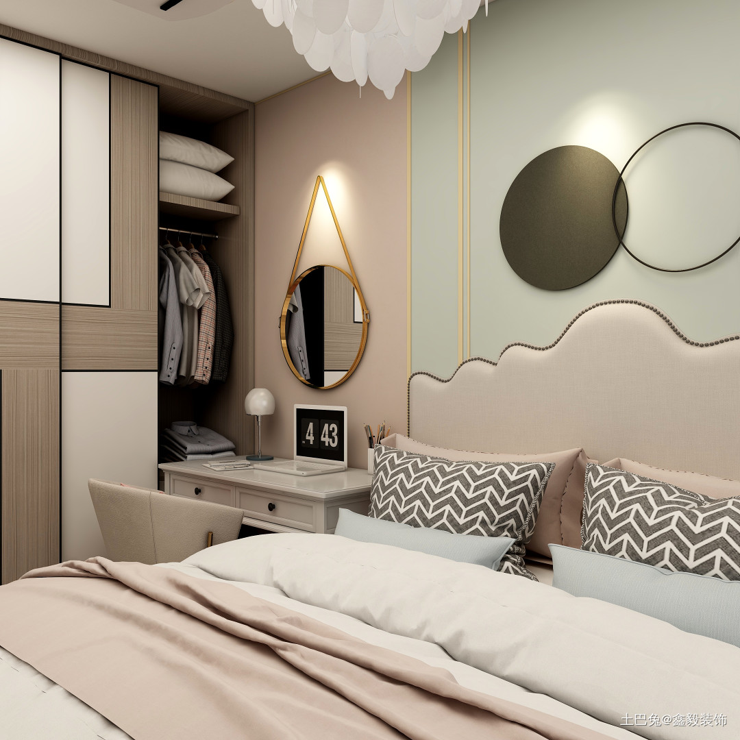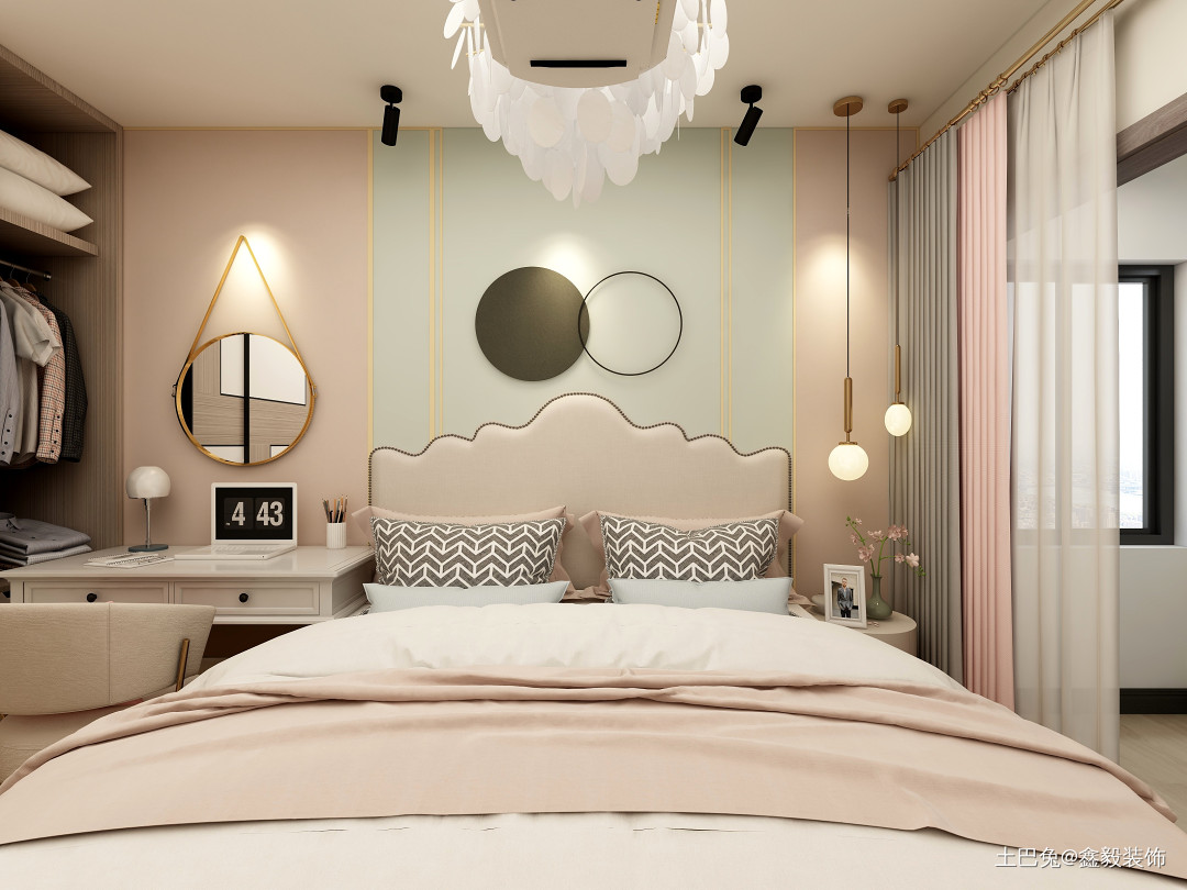 主卧采用多色搭配,情调清新,在加了点个性化造型装饰。