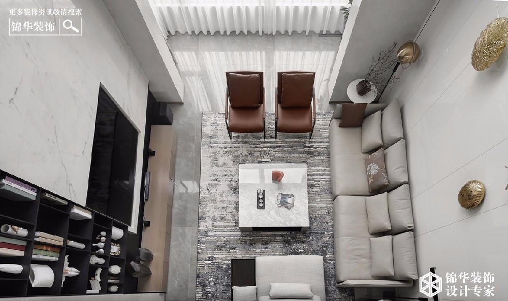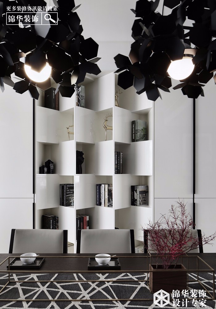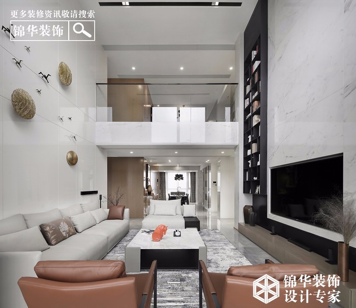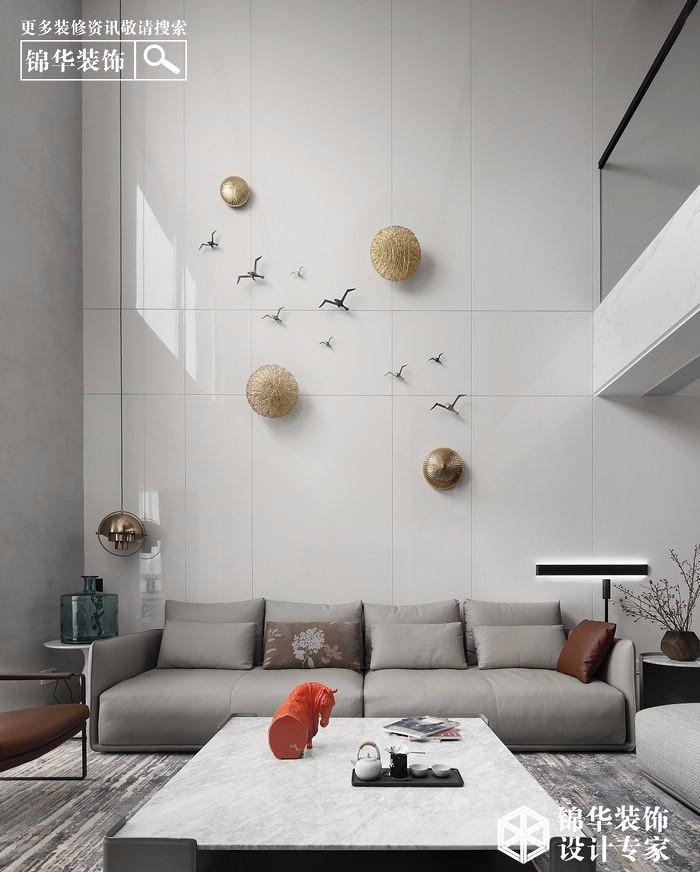 挑高的客厅,一面贯穿两层的装饰架与电视墙协调的并列摆放,不仅解决了空间需要的功能,书和艺术品还在视觉上丰富了简洁单调的空间。沙发背景的墙饰,一群飞翔的海鸥给空间带来了生气。别致的金属吊灯和壁灯,与墙面造型线条呼应,产生了不一样的空间魅力。