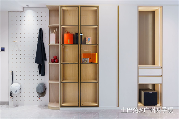 玄关沿着6715mm长度墙体做了一整排柜子,左侧留了圆弧隔板柜,平时可以放置一些小物件及摆件。玻璃双开门展示柜,加入灯光设计,让柜子藏品更有活力,便于屋主的收藏。