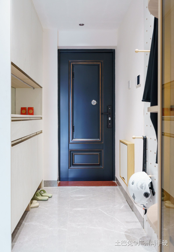 另一侧布置了1000mm*2800mm的洞洞板,头盔、钥匙、雨扇等都可以挂置,增强收纳的同时墙面又得到美化。