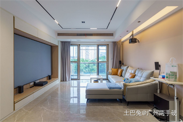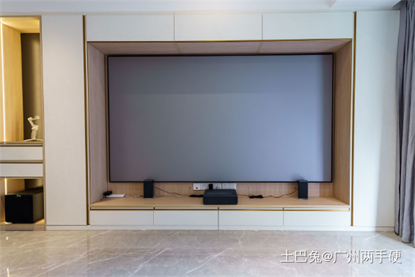 客厅打造了白色I型地柜,上面定制了2000mm长度的收纳柜,中间预留了2000mm*1400mm尺寸的位置,放置100寸抗光画框幕布,下方预留了插座,平时可以用放置影音设备。