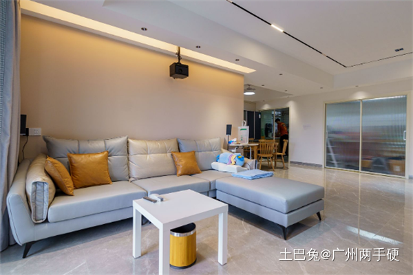 客厅区域用皮质多功能沙发+白色茶几,沙发背景刷了暖色乳胶漆,上方吊顶预留了灯槽,安装了灯带、投影仪,暖色光为背景打造以娱乐为主的客厅活动区域。