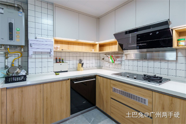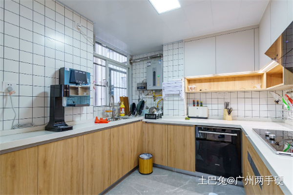 就功能性而言,无拉手设计让厨房空间更加有秩序。操作台和烹饪区合理分区,在操作台设置了灯带,弥补光线不足,防止切到手。