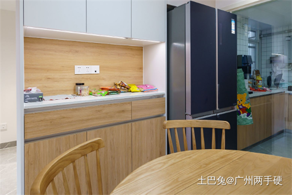 餐厅沿着2200mm长度墙体做了柜子,左边留了一个台面空间,加入插座和灯光设计,可以放置一些小家电及小物品,右边为双开门冰箱预留了内嵌位置,为日常生活提供了便利。