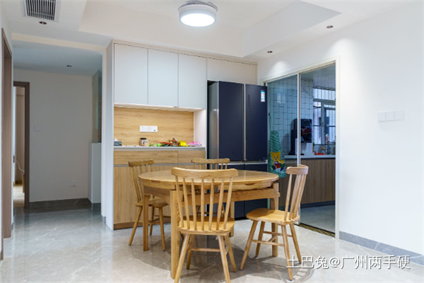 厨房在餐厅门口拆除1600mm*2100mm长度的墙体,新建厨房门洞。原厨房门新建900mm*2100mm长度的墙体,把原厨房门封闭。厨房到餐厅动线得到优化,厨房餐厅交互能力提升。