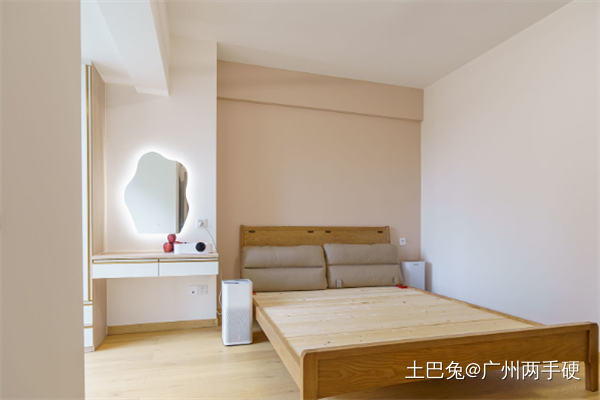 主卧选择大面积的杏色上墙了,使空间更加明亮舒适。原木色的木地板拼贴,起到拉伸空间的视觉效果,原木色的床架、梳妆台,给人温润且优雅的感觉。