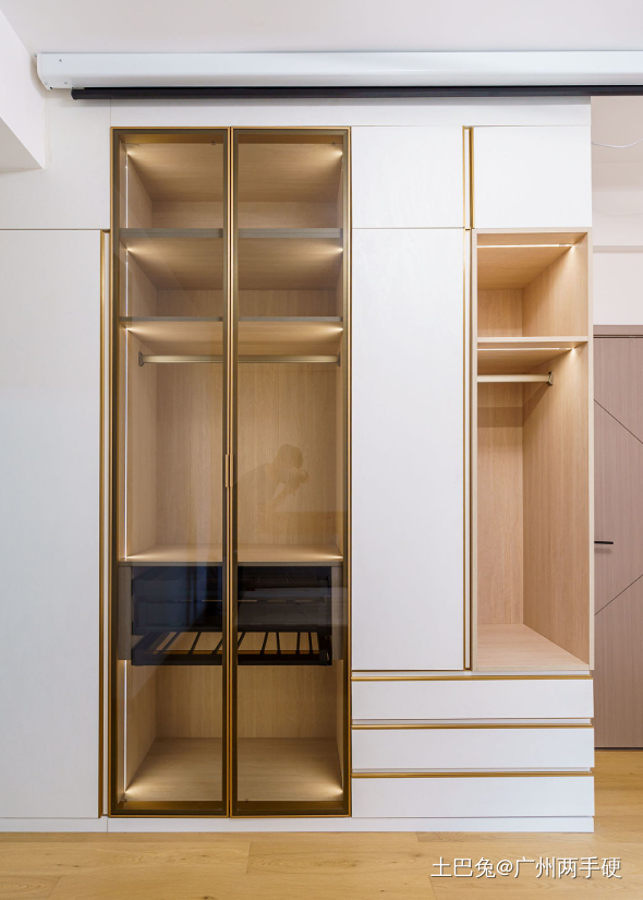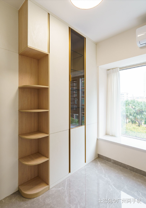 另一侧做的隔层收纳,预留了梳妆台跟插座的位置,高低柜的设计让空间更加开阔。纯白的色调拼接了原木色,再加上充沛的自然光,小空间给人的感觉格外明亮、干净。