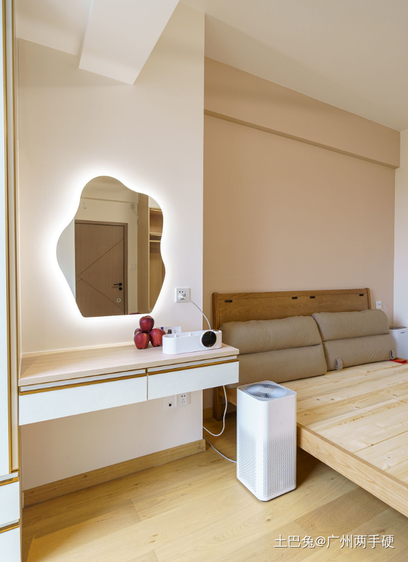 没有采用传统的桶灯,选择了流行的无主灯设计,使空间更加的简洁清爽,视觉效果也更加的开阔。床头一侧利用凸出的墙面定制了壁挂式梳妆台。镜面也是选择了流行的不规则状,背开一条灯光槽作为氛围灯光,增加整体宁静温柔的空间氛围。