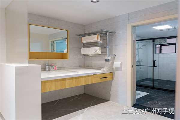 洗手台外置,新建800mm*1200mm长度的矮墙,上方设置1600mm高度的彩虹玻璃,让洗手台更加明亮。洗手台采用台下盆,石英石台面,原木色柜子和镜面柜。