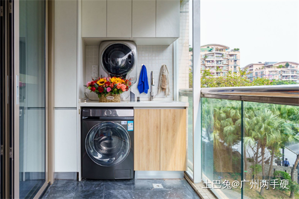 阳台没有采用落地玻璃封边,推拉玻璃门隔断,彼此之间区分出了生活面积。作为晾晒阳台,洗衣机+洗手池是必不可少的。利用墙体一侧做的嵌入式洗衣机加洗手台组合,搭配吊挂式白色的柜体,更显一份洁净。